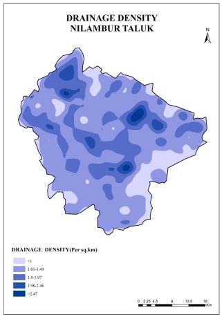 The drainage density map represents the closeness of the spacingofstreamchannels.Itisameasureofthetotallength ofthestreamsegmentofallordersperunitarea[8].Since