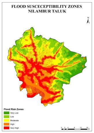 As can be observed in the map the very high-risk zonesareneartomainriverchanneloftheChaliyarRiver, whichhasmostsettlements,andagriculturalland,withlow elevation and slope and moderate rainfall and drainage density. Vegetation plays a crucial role as the areas categorisedundervegetationarefoundtobewithinlowto verylow-riskzones.