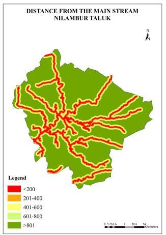 The distance fromthe mainstreamisone of the important factorstobeconsideredduringfloodzonationmapping.The distance from the mainstream is classified into 5 classes <200, 201- 400, 401-600, 601-800, >801. The area which comeswithin<200ofmainstreamsisathigherriskandthe places which lie more than 800 meters away from the mainstreamareatverylowriskintermsofdistancefromthe mainstream