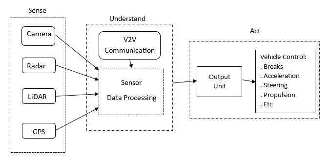 of "Sense, Understand & Act". In the sense phase, the vehicleobservesthesurroundingsandgeneratesdata.Inthe understandingphase,thedatageneratedinthetrailingphase is processed and transmitted to the algorithms. Then algorithmsdecidewhatelseneedstobedone.