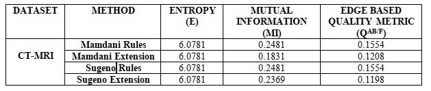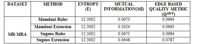 Thetable4aboveliststheobjectivecriteriaforMRandMRA pictures.Here,thequalitymeasurebasedonedges,mutual information,andentropyarecomputed.BothMamdaniand Sugenohavethesameentropyvalues.SugenoFISimprovises Mutual Information values in contrast to Mamdani FIS. MamdaniandSugenorulesbothhavethesameEdgeBased Quality Metric values, yet Mamdani's (QAB/F) values are higherthanSugeno's.