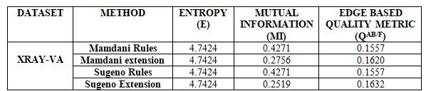 Thetable4aboveliststheobjectivemetricsforbothVAand XRAY pictures. Here, the quality measure based on edges, mutual information, and entropy are computed. Both MamdaniandSugenohavethesameentropyvalues.Sugeno FIS improvises Mutual Information values in contrast to Mamdani FIS. The Edge Based Quality Metric values for SugenoandMamdanirulesarethesame,whileMamdani's (QAB/F)valuesarehigherthanSugeno's.