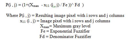 Itistheprocessoftranslatingsharpvaluesintothedegreeof membershipmeantforfuzzysetlinguisticvariables.Fuzzy Inference System Tool Box is used to create membership functionsanddeterminethedegreeofmembershipvalues foreachpixel'sintensityfluctuation.Thefollowingequations determinethemembershipfunction.