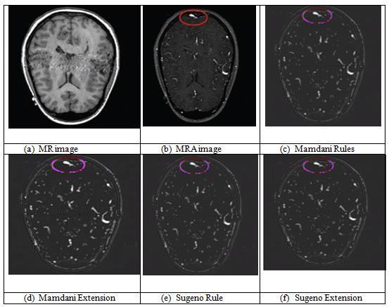 ThefusionfindingsofMRandMRAimagesaredisplayedin Figure4.TheMRinputpictureispicture(a),whiletheMRA input image is Image (b). The fused pictures from the MamdanirulesareshowninImage(c),whilethefusedimages fromtheMamdaniextensionmethodareshowninImage(d). Itisobviousfrompictures(c)and(d)thatthefusedimage producedbyMamdanirulesissubstantiallylessclearthan theonegeneratedbyMamdaniextension.Thefusedimage obtained from the Sugeno extension method is Image (f), while the fused image obtained from the Sugeno rules is