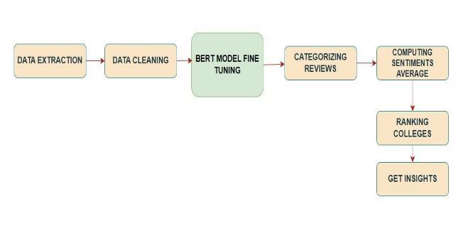Category-wise Scores: After the fine-tuned BERT model classifieseachreviewandassignsasentimentscore(based on your chosen classification approach – binary or multiclass),weaggregatethesescoresbasedonthepre-defined categories (e.g., placements, infrastructure, quality of education). Forinstance,wecalculatetheaveragesentiment scoreforallreviewscategorizedaspertainingtoplacements.