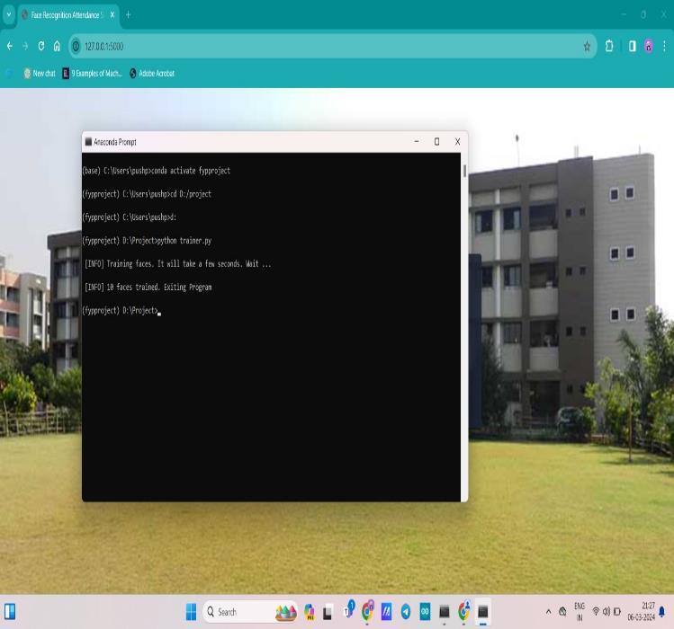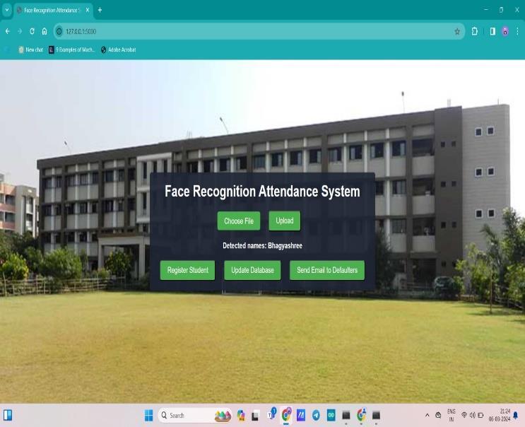In conclusion, the development of a Python Flask-based websiteforattendancemarkingthroughimageprocessing offers an efficient and user-friendly solution for educational institutions. By allowing administrators to upload student images and automatically mark attendance,itstreamlinestheprocessandreducesmanual effort. The incorporation of a login page ensures secure access for administrators. Additionally, the integration of the yagmail library facilitates communication by enabling administrators to easily notify students with attendance below 50% via email at the end of each month. This system not only saves time but also promotes accountability and transparency in attendance tracking. Overall, the utilization of image processing technology alongside web development tools enhances the functionalityandeffectivenessofattendancemanagement systems, catering to the evolving needs of educational institutions.
