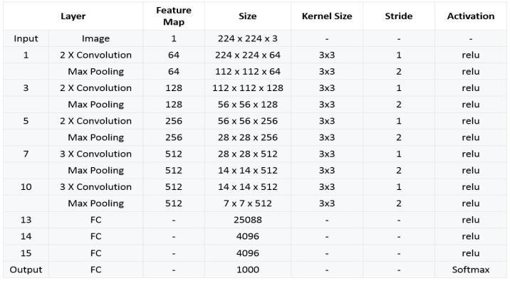 A convolutional neural network (CNN) architecturecalled VGG16 was put forth by the University of Oxford's Visual GeometryGroup(VGG).Itiswellknownforbeingbotheasy to use and efficient at classifying images. This is a quick synopsisofVGG16:1.Architecture:Thereare16layersin VGG16, comprising 3 fully connected layers and 13 convolutional layers. The convolutional layers have small 3x3pixelreceptivefieldsandarestackedoneontopofthe other. The feature maps' spatial dimensions are down sampledbytheusageofmax-poolinglayers.2.FilterSize: VGG16employs3x3filterswitha1-pixelstrideinallofthe convolutionallayers.Thistinyfiltersizekeepsthenumberof parameters reasonable while enabling a deeper network design3.Depth:ComparedtoearlierCNNarchitectureslike Alex-Net,whichhadjust5convolutionallayers,VGG16has 13 convolutional layers, making it deeper. With higher depth, VGG16 can extract more intricate features from photos.4.FullyConnectedLayers:TheVGG16architecture consistsofthreefullyconnectedlayerswith4096neurons each,whichcomeaftertheconvolutionallayers.Afinalsoft-