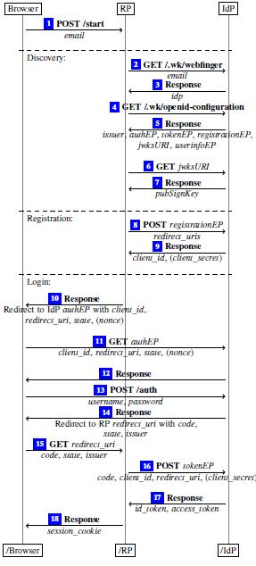 ThestagesoftheprotocolareillustratedinFigure(3)[3]. Initially, the user begins the login process by entering the emailaddress,whichhesendstotheRPserviceproviderin step 1. After that, the service provider uses the discovery service to collect information from the identity provider (IDP), where the service provider uses the WebFinger mechanism to discover information from the identity provider.Forthisdiscoverytheserviceprovidercontactsthe serverasdescribedinstep2whichrespondsbysendingthe addressoftheidentityproviderinstep3