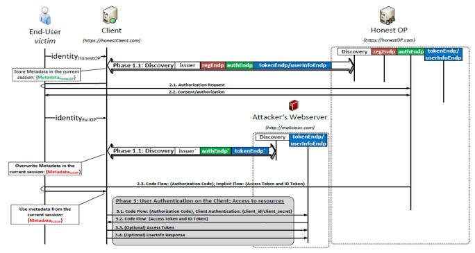 The attacker's intent is to overwrite data stored in the session to force the client to use the attacker's malicious detectionservice.Forthispurpose,itsendsasecondrequest to the client containing the identity alice@malicious.com. The attacker forces the user's browser to send two HTTP requests. As a result, the client detects the malicious detection service, identifies endpoints, and replaces old session data with new data (Metadata EvilOP). The client thenreceivesthecodefromthepreviousstageandsendsit withitscredentials(client_id,client_secret)totheendpoint ofthecodesstoredintheattacker'ssessiondata.Asaresult, theattackerreceivesaccesstokensandisabletoaccessthe lockedresourcesintheOPidentityprovider.
