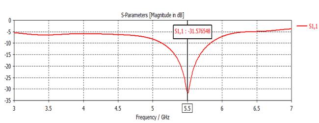 The amount of electromagnetic power that the microstrip patchantennareflectsbackismeasuredbyreturnloss,also known as the S parameter. This quantity is also known as the reflection coefficient. It determines how well the measured load at the receiving end and the transmitting end match in terms of impedance (source).An efficient radiationmodehasareturnlossoflessthan-10dB.Figure 2 shows the S parameter vs frequency curve for the proposedantenna.Itisclearthattheresonancefrequency of the proposedantenna is5.5 GHz. The graph shows that at 5.5 GHz, the antenna's return loss is -31.58 dB, which indicates a smaller energy loss and better impedance match.