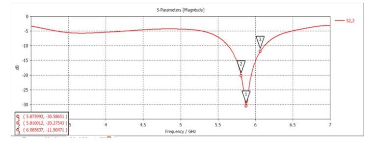 It can be observed that the suggested antenna's resonance frequency is 5.87 GHz. The graph demonstrates that the antenna's return loss is30.58 dB at 5.87 GHz, indicating a better impedancematchandlessenergyloss.