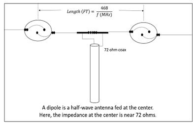 Theendofatransmissionlinethatradiatesenergythrough a bent wire like this is called a dipole, or dipole antenna. Thereactanceoftheinputimpedanceisdeterminedbythe dipole's length and radius. The amplitude of the reactance rises as the radius decreases. It corresponds to the wavelength. Thus, the length and radius of the dipole also needtobeconsidered.Usually,ithasanimpedanceof72Ω.
