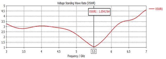 VSWR is used to measure the impedance mismatch between the transmission line and antenna. When an antenna is well-designed, its VSWR value should be less than2.Thesuggestedantenna'sVSWRVs.frequencyplotis shown in Fig, where it can be observed that the value of VSWR is 1.054, much less than 2, at the resonance frequency of 5.5 GHz. The suggested antenna's improved impedance match to the transmission line is shown by a lowerVSWR,whichalsoindicatesahigherpowersupplyto theantenna.