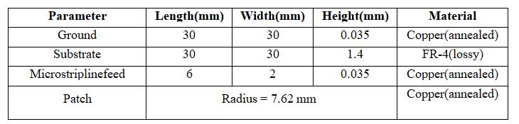 Theantenna designparametersforWLAN band& WiFi (5.7–6.15) GHz are computed as follows. Here, a FR4 (lossy) substrate with a dielectric constantof4.4isemployed,and1.4mmisselected asthesubstrateheight.