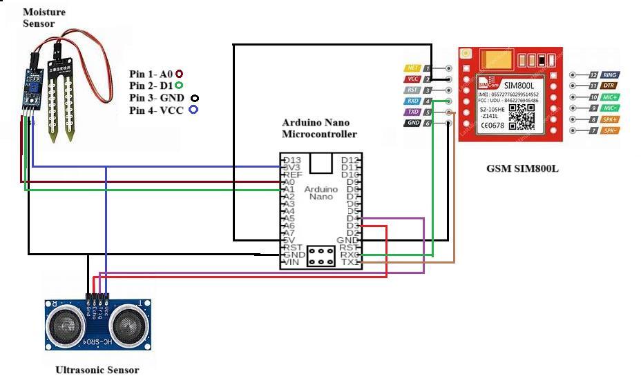 SWMS is implemented using GSM module, sensors, and microcontroller. Below circuit diagram shows the integration of hardware to enable monitoring of the bin levels and moisture level and provide real-time data for efficientcollectionofwaste.