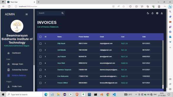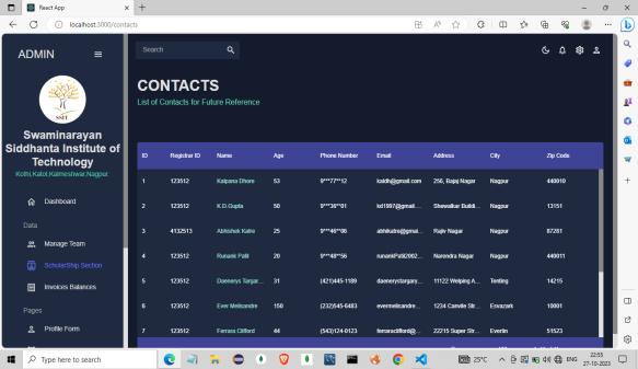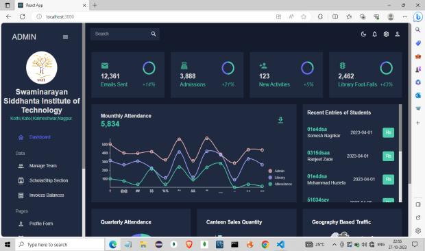 The student dashboard acts as a centralized hub, offering access to essential data like exam results, assignment deadlines, scholarship information, exam schedules, an online library catalog, and updates on extracurricular activities. Through an intuitive interface, students can effortlesslystayupdatedonimportantdates,requirements, andopportunities,enrichingtheiroverallcollegeexperience. Following the Model-View-Controller (MVC) architectural pattern, our project emphasizes a visually appealing and interactive user interface crafted using React. This design approach enhances user engagement and ensures a responsiveexperience.