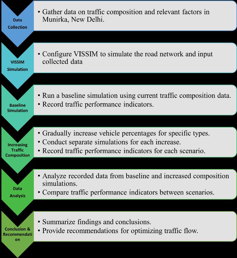 To conduct this analysis, we will gather comprehensive data on traffic composition in the Munirka Intersection, including different vehicle types such as two-wheelers, four-wheelers, heavy commercial vehicles, and others. Additionally, we will consider factors like traffic volume