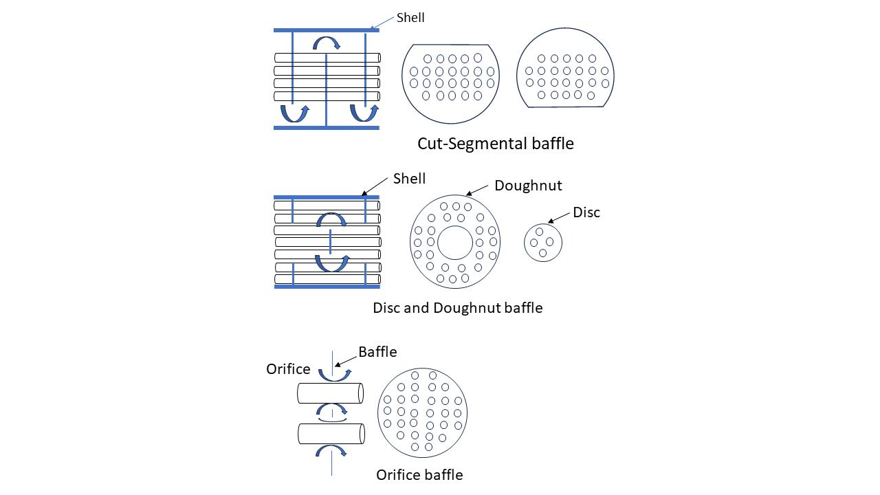 Baffles: Baffles are plates or rods that are placed inside the shell to direct the flow of the process fluids. They enhance heat transferbycreatingturbulenceandpreventingfluidbypass.Theyalsoprovidesupporttothetubesandpreventsagging.