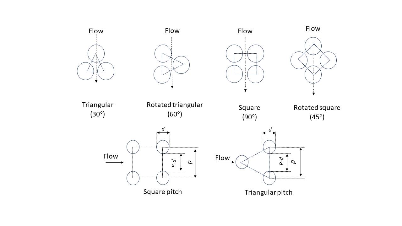 TubearrangementsinSTHEcanbeorganizedinequilateraltriangular,square,orrotatingsquarepatterns,withtriangularand rotatedsquarepatternsprovidinghigherheattransferratesbutalsohigherpressuredrops.Squarearrangementsareusedfor heavily fouling fluids that require mechanical cleaning of the tube exteriors. The recommended tube pitch is 1.25 times the tube outside diameter, and a minimum clearance of 0.25 in. (6.4 mm) is recommended between tubes in a square pattern Tube-side passesare used toincreasethelength ofthe flowchannel,withthenumberof passesdetermined bythe required