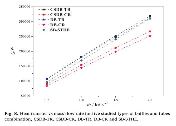 Higher flow rates lead to greater fluid movement and interaction with the heat transfer surfaces, but also result in more friction and resistance to flow. Performance evaluation factor (Q/Δp) and performance evaluation criteria (PEC): Both decrease with increasing mass flow rate. These metrics consider the trade-off between heat transfer (Q) and the pumping powerrequiredtoovercomepressuredrop(Δp).Asthepressuredropincreasesdisproportionatelywithflowrate,theoverall performance (Q/Δp and PEC) suffers[3].mass flow rate recovery in the design and optimization of shell and tube heat exchangers,leadingtoimprovedefficiencyandcost-effectiveness[15].