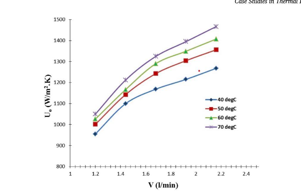 the hot side flow rate increases, the convective heat transfer coefficient also increases. At higher tube side flow rates, the influenceofthehotfluidinlettemperatureontheheattransfercoefficientishigher.Thehighestvalueoftheconvective heat transfercoefficient(Uo)was1466W/m^2×Kataflowrateof2.16l/minandaninlettemperatureof70°C.Thisrepresentsan increaseof15.6%comparedtoitsvalueat40°C[1].