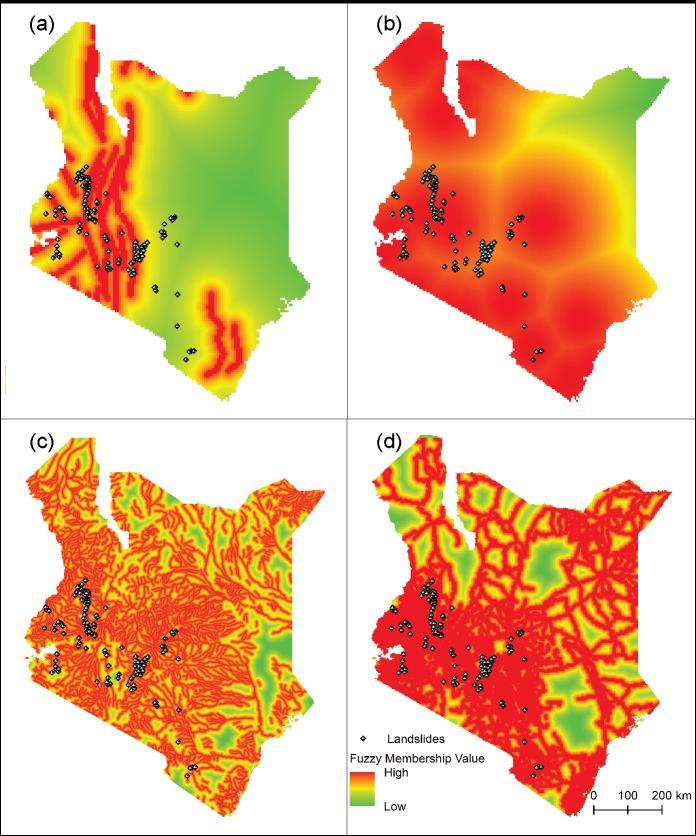 Toensureconsistencyandcompatibility,allthematicmaps wereclippedtotheadministrativeboundariesofKenyaand projectedintoacommongeographiccoordinatesystem.The featureproximity(buffering)wasapplied,followedbythe conversionofpolygonstorasterformatandresamplingto match the spatial resolution of the SRTM-DEM (30 m). Finally, the thematic maps were standardized into four linear classes and utilized in the weighted overlay model (Figure3and4).Differentclassificationswereconsidered forthefuzzylogicmodel,asexplainedinthefuzzymodeling section.