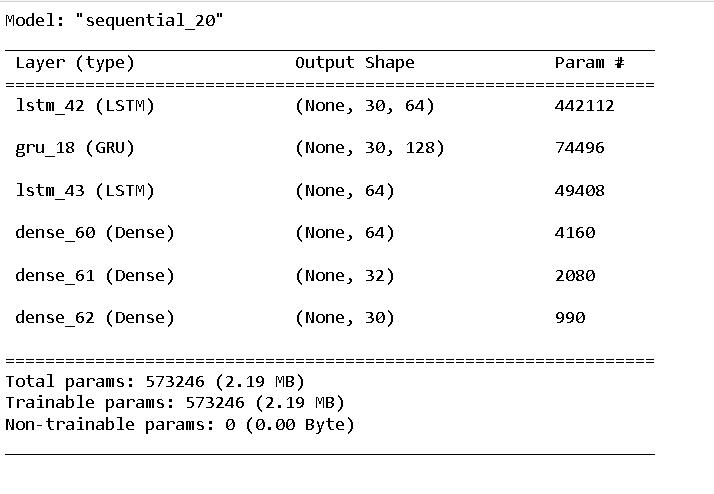 ThearchitectureofthestackedLSTMlayersinadditionto dense connection layers is responsible for hierarchical representation learning. For LSTM model, 3 LSTM layers areadded. The first,second andthirdlayershave64,128 and 64 units respectively. The 1st and 2nd layers return sequences which are given as input for the next layer except the 3rd layer. ReLU (Rectified Linear Unit) function used promotes non-linearity; neural networks with this activation can learn complex patterns easily. 3 dense layers are added after the LSTM layers to further process the extracted features for better classification. Adam optimizer is then used to compile the model and categorical_crossentropy is used as loss function. We choose the number of epochs for training the model and tracktheaccuracyusingTensorBoard. Thearchitectureof the model is same for GRU, LSTM+GRU model as well, except in LSTM+GRU model the first and third layers consist LSTM and the third layer consists of GRU respectively.