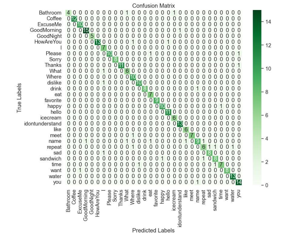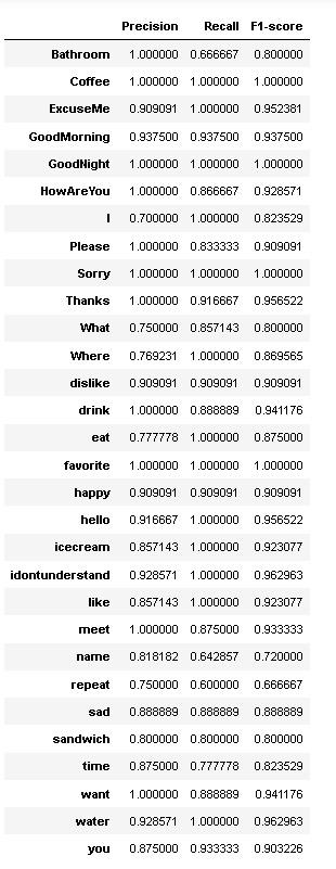 From our comprehensive analysis, it's evident that the accuracy of our modelsis intricatelylinked to the number and nature of words considered for training. Different word types exhibit varying accuracies, underscoring the importance of meticulous data curation. Smooth training processesandhighaccuraciesareobservedforwordswith consistent data representations. Furthermore, the choice between LSTM, LSTM+GRU, or GRU architectures significantly influences both training speed and final accuracy. Notably, GRU requires the fewest parameters, whileLSTMtypicallydemandsmore.Theinclusionofmore wordsleadstoadeclineinfinalaccuracy,attributedtothe increased data volume and complexity of model parameters. Despite leveraging extensive datasets comprising50videoswith30frameseach,ourmodelsstill achievecommendableaccuracyvalues.