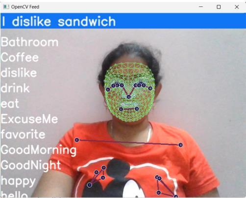OpenCV library is used to access live camera feed and to capture video data in the form of frames. Media Pipe modelisusedtodetectallthelandmarksandtheobtained key-points are stored in NumPy arrays for respective frames. Sequential data is obtained by using this method and an ISL dataset is created. The list of words includes (Bathroom, Coffee, dislike, drink, eat, ExcuseMe, favorite, GoodMorning, GoodNight, happy, hello, HowAreYou, I, icecream, idontunderstand, like, meet, name, please, repeat, sad, sandwich, Sorry, Thanks, time, want, water, What, Where, you). There are a total of 30 words in the list. For each word, data worth of 50 videos is recorded during dataset creation with each video having 30 frames each.