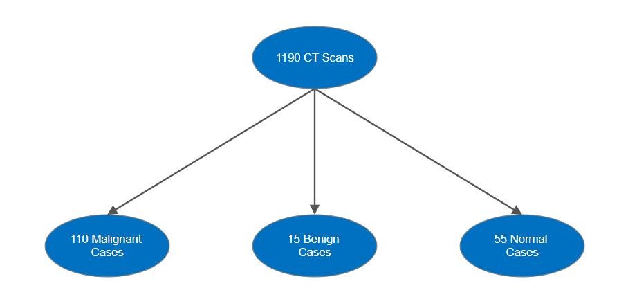 The dataset sourced from kaggle consists of CT scans collected over a 3-month period in the fall of 2019. It includesimagesofpatientsdiagnosedwithvariousstages of lung cancer, as well as images of healthy individuals. The slides were annotated by expert oncologists/radiologists at the IQ-OTH / NCCD. The total size of the dataset is 209 MB and the dataset includes 1190 CT scan slices from 110 cases classified as normal, benign, or malignant classes. In particular, 40 cases were malignant,15werebenign,and55werenormal.Thescans were originally scanned using DICOM format using Siemens’SOMATOMscanner.Thestandardprotocolis120 kV, slice thickness is 1 mm, and the window width and center setting are specified. Each scan includes 80-200 slicesrepresentingvariousanglesofthechest.