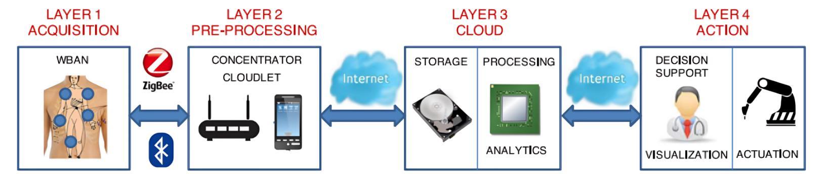 The action layer can provide either “active” or “passive” action.Inactiveaction,anactuator,suchasaroboticarm,is activatedbasedontheresultsofalgorithmsrunninginthe cloud. Examples include robot-assisted surgery [17]. In passiveaction,nophysicalactionoccurs.Theoutcomesof analyticsormedical applicationresultsarepresentedto the requesting authority to provide decision support. An exampleisthevisualizationofapatient’slong-term(24-hr) HolterECGmonitoring,allowinga doctorto review20-30 patients’resultswithin10-20seconds[22].