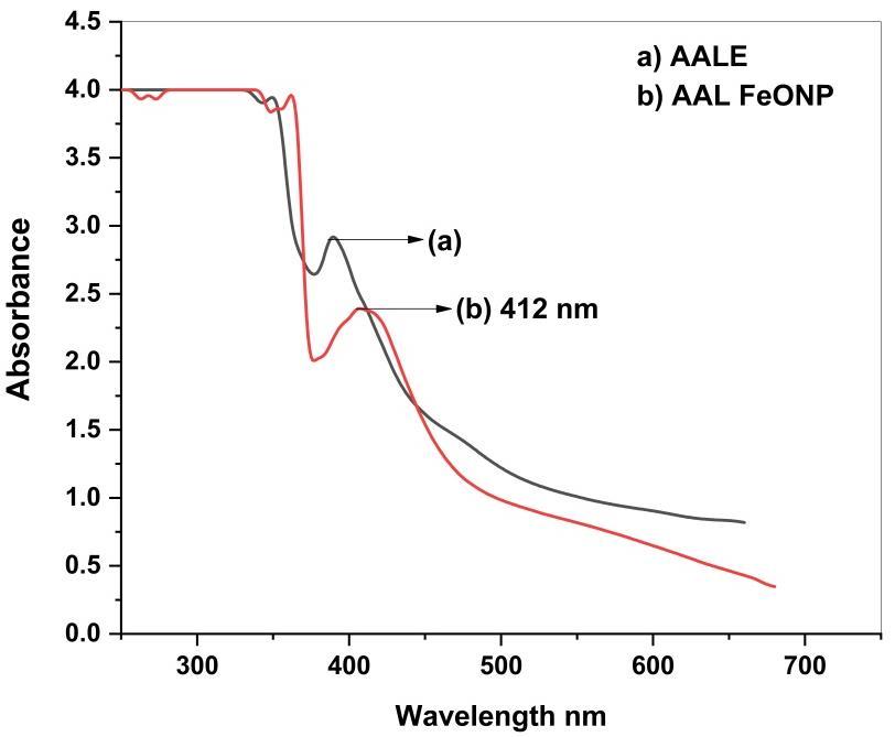 As can be seen from Figure 2, the absorption peaks for Albizia amara leaf extracts are around 370 to 390 nm, which correspondstotheexistenceofseveralnaturalcompoundsintheextracts[9].Thesepeaksarevanishedafterreactingwithan iron salt, indicating that the extract compounds acted as reducing and capping agents to synthesize the iron oxide nanoparticles.Furthermore,andinaccordancewiththeresultsofthepresentstudy,thesurfaceplasmonbandforironoxide nanoparticlesatwavelengthsof412nmindicatetheformationofironoxidenanoparticleswerereportedbypreviousstudies (Figure2)[10].