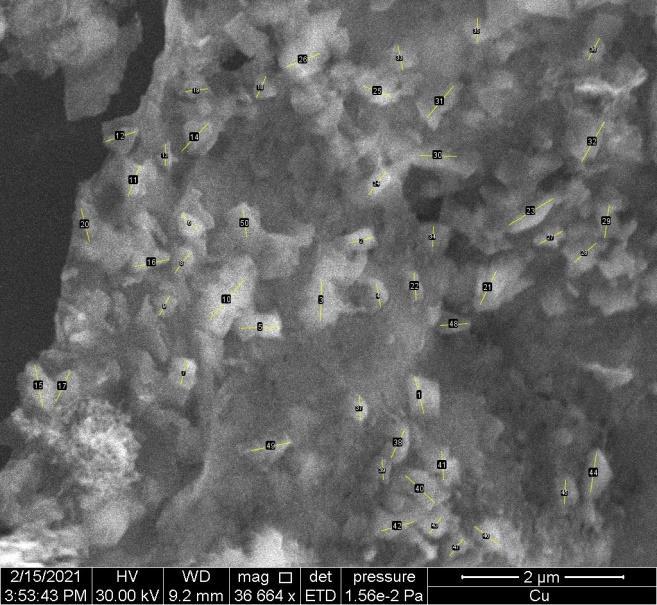 Themorphologyofthepreparednanoparticleswasexaminedusingscanningelectronmicroscopy.Figure5showstheFESEM imageofthesynthesizedFe2O3 nanoparticlesconsistedofnano-sizedparticleswithanearlysphericalshape.Itwasobserved thatthenanoparticlesformedwereagglomeratedwiththeparticlesandappearstoadheretoeachother,formingaggregateof particles, which result in irregular arrangements. The particles sizes measured about 9 to 12 nm, hence supporting the TEM result.