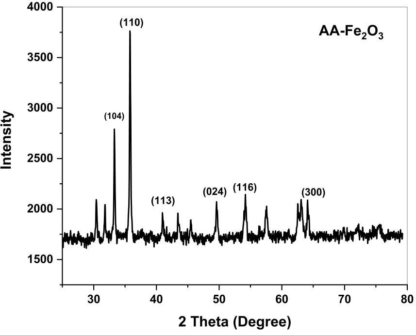 XRDisananalyticaltoolusedtodistinguishcrystallinephaseandcelldimensionsofsynthesizednanoparticles. Fig(6)Shows theappearanceofdiffractionpatternat2θ= 35.12º,36.63º,40.64º,49.97º,57.08 º and65.49º withcorrespondinglattice plane values at (104), (110), (113), (024), (116) and (300) respectively. The intense and sharp peaks undoubtedly revealed thatironoxidenanoparticlesformedbythereductionmethodusingAlbiziaamaraleafextractwerecrystallineinnature.The crystallinesizewascalculatedwiththehelpofScherrer’sformula,whichisgivenas[13]