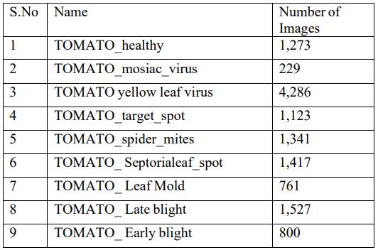 Each image is connected to one of 38 classes, which stand fordifferentplantdiseasesorhealthy conditions.Ourmain target is on tomato leaf and the dataset of tomato has the followingasshowninTable1.