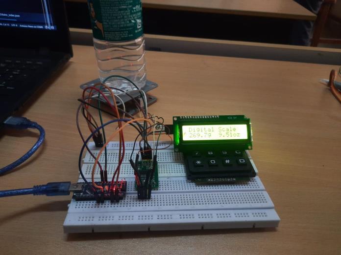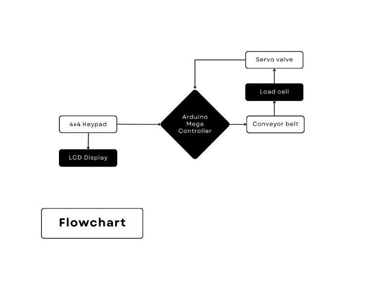 WeusedanHX711A/Dpressuresensortogetherwith a5kgmaximumweightloadcelltopreciselymeasurethe weight and interpret the load cell's output. We included a 4x4keypadmodulecontainingalphabetsfromAtoD and numerical digits from 0 to 9 to input weight values. Function keys for operations like clear and enter are represented by alphabets which can be assigned while programming. We included a 16x2 LCD module that displays the weight of the filled container in real time, helpingustoconfirmtheenteredweight.