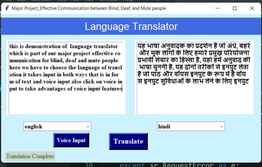 Abstract - Communication is essential for individuals with disabilities to fully participate in society. However, those who are blind, deaf, and mute face significant challenges in traditional communication methods. The paper proposes a multimodal approach to facilitate communication for individuals with these multiple disabilities. The approach combines sign language, translator, andassistivetechnologies to create a comprehensive communication system. Through voice assistant, individuals who are blind can receive information through voice or touch, while translator devices provide real-time feedback. For sign language gestures. Additionally, assistive technologies such as text-to-speechand speech-to-text software enable individuals who are mute to communicate verbally, which can be translated into tactile or visual formats for those who are blind or deaf. By integrating these modalities, individuals with multiple disabilities can overcome communication barriers and engage more effectively with their environment and peers. This multimodal approach offers a promising avenue for enhancing communication. In today’s advance world of science and technology, communication field has developed at suchextent where we can connect to any part of the world within fraction of minutes and hour. We can send messages, make call or send documents, files to anyone, accordingtoneed. Communication has been important to express our thoughts,ideaetc.butwhen it’s come about blind, deaf and mute people’s it become difficult for them and us to communicate with each other. So, here we have made such a software which shall help them to communicate with each other without depending upon any middle man. With the help of this we would be able to help mute, blind and deaf people to communicate with each other without depending upon each other.