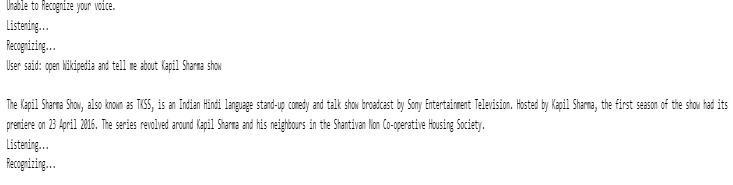 Fig7DescribestheoutputofvirtualAssistance.Itfetchesthe dataaboutKapilSharmashowfromWikipediaandgivesthe outputinformofvoiceandalsoinwrittenformat.