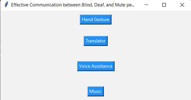 Fig 3. describes the GUI system of our project. It contains four Buttons that Hand Gesture, Language Translator and VoiceAssistance