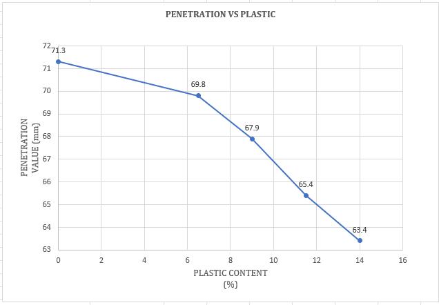 The penetration value of bitumen decreases withanincreaseinHDPEplasticcontent.This suggests that hardness increases with an increaseinHDPEplasticcontent.