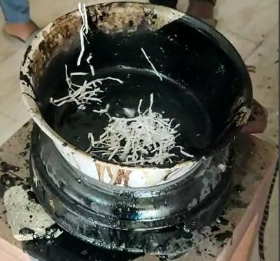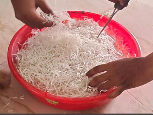 Cleaned HDPE plastic waste in the form of a cement bag is cut into 20mm x 3mm using scissors.