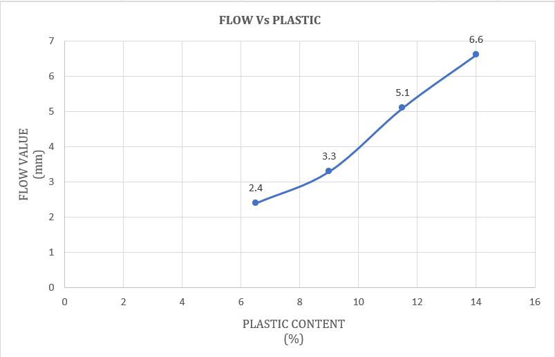 From Chart -7, we can observe that as the plastic content (%) in the bitumen blend increases the flow value monotonically increases This suggests better flexibility and providesresistancetodeformation.