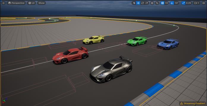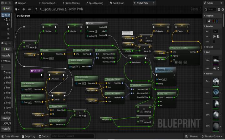 Itstartswithcreatinga newBlueprintClassfortheAIcar. It includes setting up acceleration, steering, braking, and handlingfortheAIcars,definingcheckpointsandpathsfor ittofollow,andimplementinglogicfordecision-making.