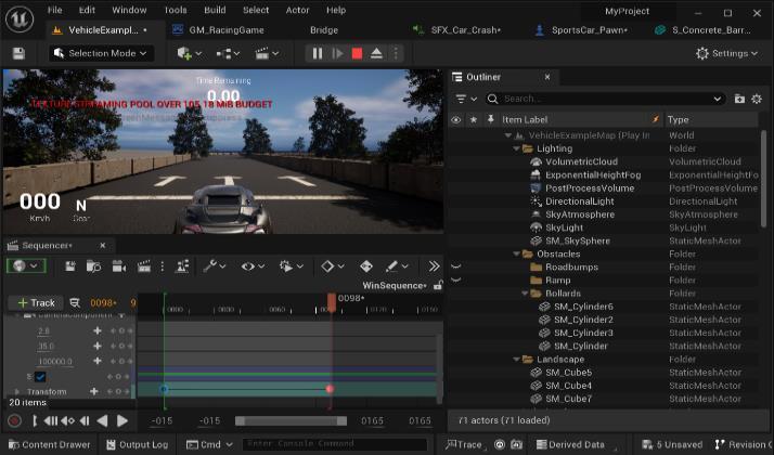 games, encompassing everything from the initial conception of an idea to the final release and ongoing maintenance of the game. It includes implementing gameplay mechanics, designing algorithms for artificial intelligence, creating graphical user interfaces, handling physics and collision detection, managing game state, and optimizing performance for a seamless player experience. It is used to create interactive entertainment, educational simulations, and virtual training experiences. Its applicationsextendtodiverseplatforms,includingmobile devices, consoles, PCs, and emerging technologies like virtual reality and augmented reality. The field combines artisticcreativitywithtechnicalskillstoproduceengaging and immersive digital experiences. The project utilizes advanced game development techniques, prominently featuring Unreal Engine 5, blueprints, and third-party assets to craft an immersive racing game that serves as a testament to the team's technical prowess and creative acumen. Leveraging Unreal Engine 5's state-of-the-art features, such as the Nanite virtualized geometry system and Lumen Global Illumination, the game achieved stunning graphics and realistic lighting effects. The integration of Blueprints facilitated the rapid prototyping of intricate game mechanics, including vehicle controls, collision detection, and event-driven systems for powerups and obstacles. Carefully selected third-party assets enhancedthevisualappeal,incorporatingdetailedvehicle models, animations, and diverse environmental elements. Through rigorous playtesting, debugging, and optimization using Unreal Engine's profiling tools, the team delivered a showcase of technical innovation and creative excellence in the realm of video game development.
