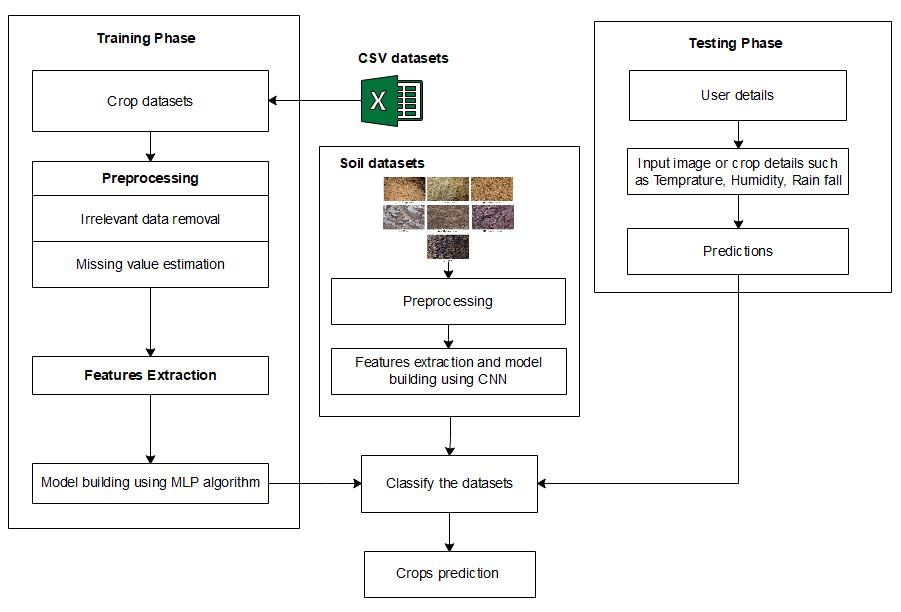 inputvariablesandoutputpredictions.Duringtraining,the weightsoftheseconnectionsareadjustedtominimize the errorbetweenthepredictionandtheactualreturn.Oncethe MLPmodelistrainedandvalidated,itcanbeusedtopredict future crop yields based on new inputs. Input data often includesinformationaboutweather,soilquality,croptypes, andotherimportantfactors.TheMLPmodelprocessesthis inputdataandproducesapredictionoftheexpectedreturn. ThenusetheCNNalgorithmtotraintheimage.Thedatais dividedintotrainingset,validationsetandtestingset.The trainingprocessisusedtotraintheCNN,andthevalidation processisusedtotunethehyperparametersofthemodel and prevent over fitting. The testing procedure is used to evaluate the final performance of the model. Designing a CNNarchitecturesuitableforclassificationofgroundimages. This will include choosing the number and size of convolution and pooling operations, choosing the optimization function, and deciding on redundancy and optimization. Train the CNN ontrainingusing backpropagation and gradient descent. Monitor your model's performance through the validation process and adjusthyperparametersasnecessarytoavoidoverfitting.