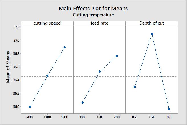 The obtained S/N ratio response table for the cuttingtemperatureisshowninTable4. Figure3represents themeanS/NratiographobtainedinMinitabsoftwaretool. Higher S/N ratio represents the minimum variation difference between the desirable output and measured output.FromFigure3,itwasnoticedthatthehighestmean S/Nratioobtainedforcuttingtemperaturearecuttingspeed at900RPM,feedrateat100mm/tooth,depthofcut0.6mm mmrespectively. Therefore,thepredictedoptimumprocess parametersforobtainingthelowcuttingtemperatureusing Taguchi method were found as cutting speed at 900RPM, feedrateat100mm/tooth,depthofcut0.6mmrespectively. Figure4showstheimpactofindividualprocessvariableson cuttingtemperature.