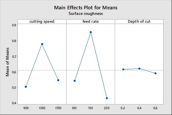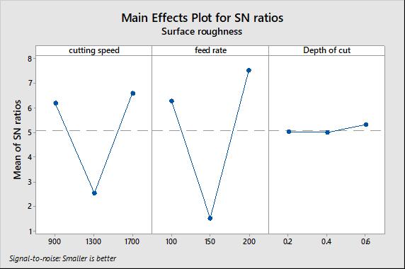 The obtained S/N ratio response table for the surfaceroughnessisshowninTable5. Figure5represents themeanS/NratiographobtainedinMinitabsoftwaretool. Higher S/N ratio represents the minimum variation difference between the desirable output and measured output.FromFigure5,itwasnoticedthatthehighestmean S/Nratioobtainedforsurfaceroughnessarecuttingspeedat 900RPM, feed rate at 200 mm/tooth, depth of cut 0.6mm respectively. Therefore, the predicted optimum process parametersforobtainingthelowsurface roughnessusing Taguchi method were found as cutting speed at 900RPM, feed rate at 200 mm/tooth and depth of cut 0.6mm respectively.Figure6showstheimpactofindividualprocess variablesonsurfaceroughness.