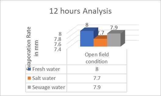 AsFig-11andFig-12showsthisstudywastakenfor3water samples and tested in open field Exposure condition, the obtainedresultsare8mm,7.7mmand7.9mmforfreshwater, salt water and sewage water respectively. so the rate of evaporation is more in fresh water compared to other 2 samples.Themeasuredphvalueoffreshwaterwas7,salt water was 8, and sewage water was about 6.5, the evaporationinsewagewaterwasfasterthansaltwater,due to presence of turbidity which absorbs heat from the atmosphere,butinsaltwaterduetopresenceofsaltinitsalt evaporationrateislowered.