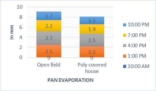 Chart-3showsthepanevaporationrateinmillimetersfor openfieldandpolycoveredhouse.thisstudywasconducted forabout12hrsat regularinterval of 3hrs.Asintheopen fieldtemperatureincreasestherateofevaporationincreases butfromtheresultthegraphshowsrateofevaporationis higherinopenfieldcomparedtoploycoveredhouse,dueto theactionofhumidityandwindspeed.