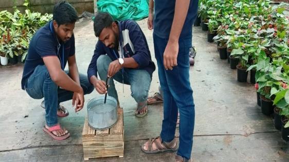 ForopenfieldExposurecondition,thestudyareaselectedis coveredwithmediumnaturalvegetation,Thewoodenbase wasinstalledatthe center placewhere noshadowoccurs from nearby plants or trees, the area should be equally levelled.Thenthesmallpanevaporimeterwasplacedabove thewoodenbase,thesamplewhichwastakenwasfilledinto thepanuptoalevelof100mm,becausetocontrolsudden overflow of water due to rain. Then we cross checked the initialevaporationratewhichis0mm.Usingtheelectronic depth gauge the evaporation rate was taken at regular intervalof12hoursfor30daysinthemonthApril(2022),